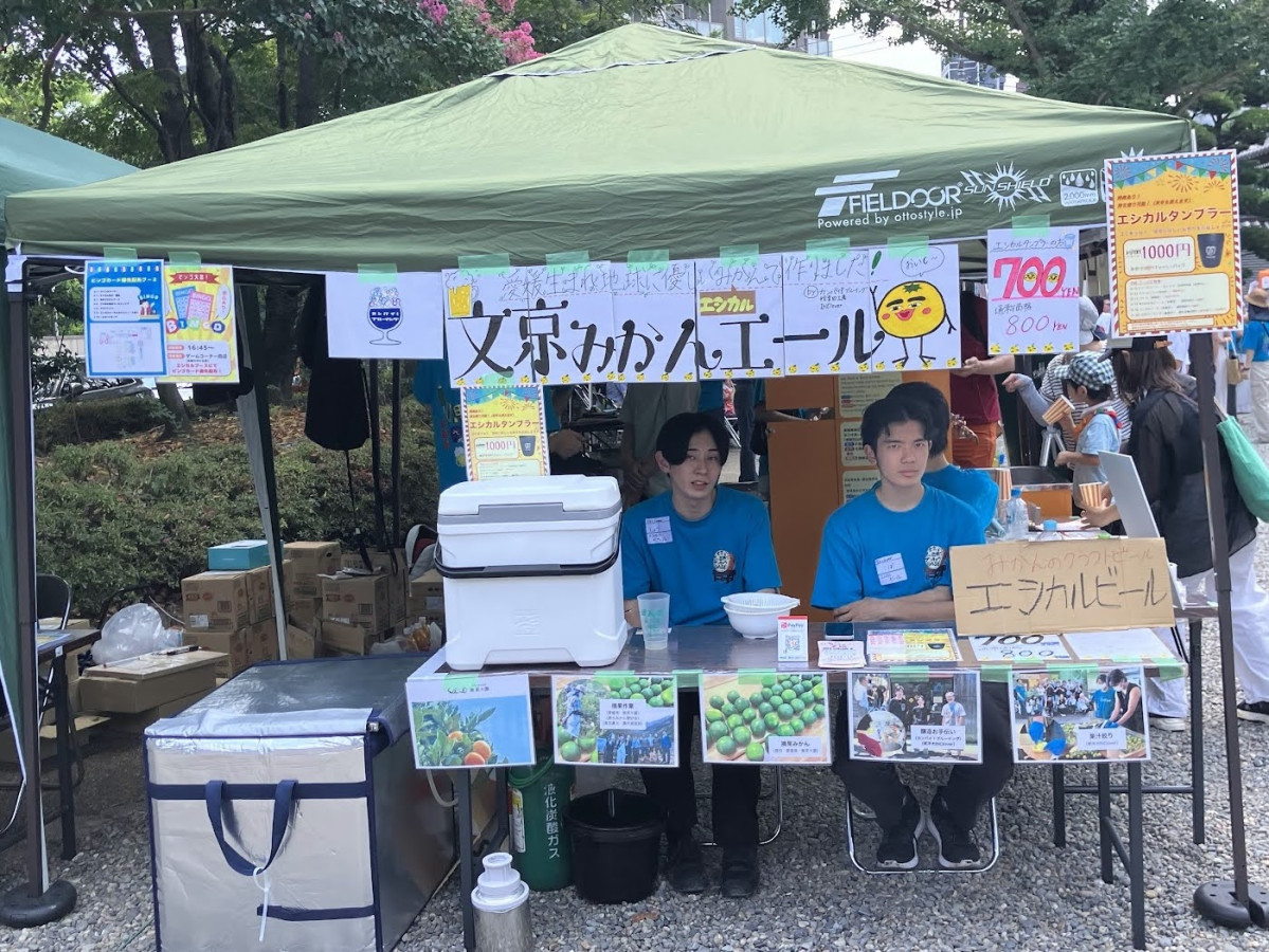 傳通院での本番は37度を超える猛暑の一日。朝から多くの来場者が訪れ、会場は熱気と笑顔に包まれた。今回、学生たちが手がけた「文京みかんエール」と蛇口から注ぐミカンジュースは、愛媛県をPRするブースの中で販売された。愛媛のミカンを生かした2種類のドリンクは、地域の魅力を伝える象徴となった。