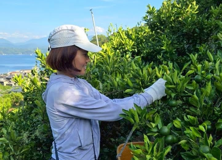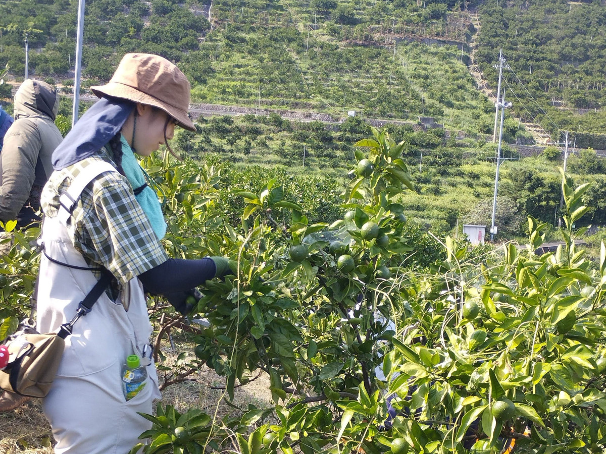 東農大・農村調査部と東大みかん愛好会のメンバーは、愛媛県西予市の「無茶々園」を訪れた。トンネルを抜け、曲がりくねった坂道を上り切ると、眼下に宇和海とミカン畑が広がる。その先の石垣に囲まれた急こう配の畑で摘果作業が始まった。