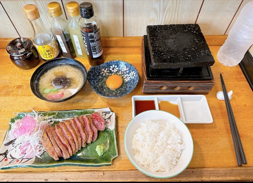 牛カツが看板メニューの同店。席数は7席。低温調理でローストビーフを作り、それをパン粉で揚げる独自の調理法が特徴。客は鉄板で炙(あぶ)て食べるか、そのまま赤身で食べる。