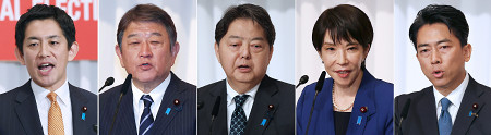 石破茂首相の後継を決める自民党総裁選は4日、党所属国会議員の投票が行われ、党員・党友票と合わせて開票される。写真は候補者。左から、小林鷹之氏、茂木敏充氏、林芳正氏、高市早苗氏、小泉進次郎氏。 【時事通信社】