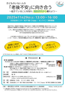 本郷の文京区民センター(文京区本郷4)で11月29日、子どものいない人が地域で安心して暮らせる社会を考えるイベント「子どものいない人の『老後不安』に向き合う~起きていることを知り、現役世代から備えよう~」が行われる。