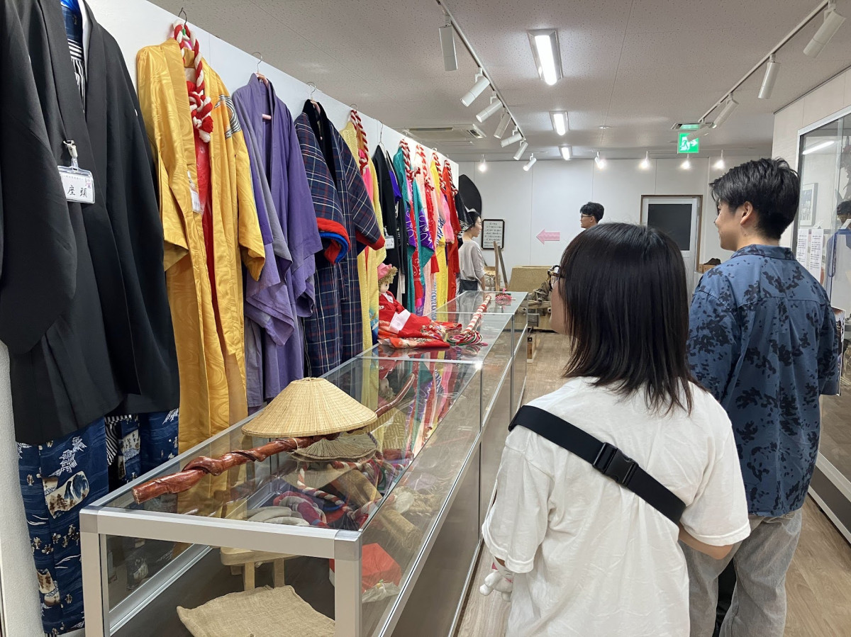伝習館に展示されている「宝財踊り」の衣装を見学する学生たち。今回の企画展でも10点を展示する