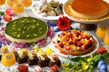 ディナーでは、シェフが切り分けるサーロインローストビーフや、つばき油を使った天ぷらなどをライブキッチンで行う。特別メニューとして、大人向けに1人1皿限定で「ボタンエビの握りと白エビ磯のり巻き」を用意。デザートにはツバキ茶とサクラクリームを合わせたシフォンケーキや抹茶ティラミスなどをそろえ、ディナー限定の会場で作るシュークリームも提供する。