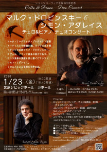 マルク・ドロビンスキーさんとピアニストのシモン・アダレイスさんによるチェロ&ピアノ デュオコンサートのチラシ