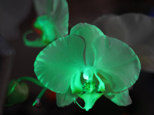 会場では2024年に初公開され話題を呼んだ「光るコチョウラン」も2年ぶりに展示する。千葉大学とNECソリューションイノベータと奈良先端科学技術大学院大学が共同開発した世界に1株しかないランで、ブラックライトの下で黄緑色に輝く。遺伝子組み換え植物のため昨年は開花がかなわなかったが、株の育成状況から再び咲く可能性があることが判明し、再展示が決まった。酒井さんは「まだご覧になっていない方や、もう一度見たい方のためにリバイバル展示を決めた」と話す。