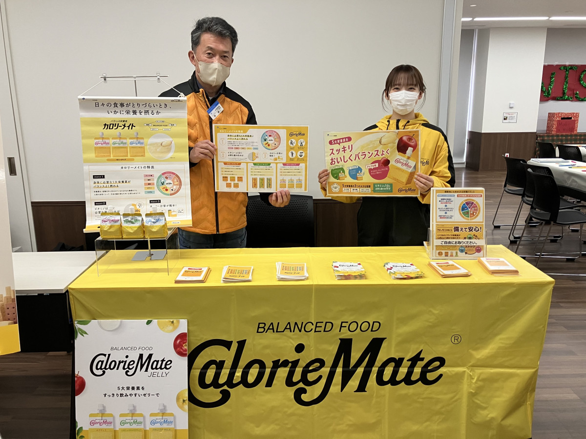 「災害時の食とココロ」展示コーナーに出展した大塚製薬の森謙二さん(左)と熱中症対策アドバイザーの三浦涼子さん