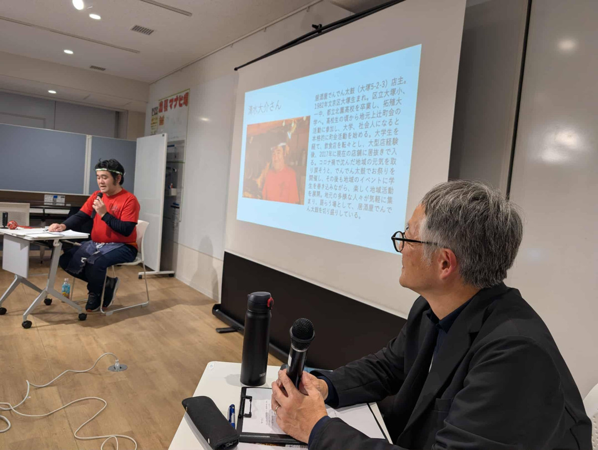 大塚地域活動センター(文京区大塚1)のオープンスペースで10月24日、地域活動を紹介するトークイベント「mTalk vol.11」が行われ、居酒屋「でんでん太鼓」(大塚5)店主の清水大介さんと中央大学の学生らが登壇した。