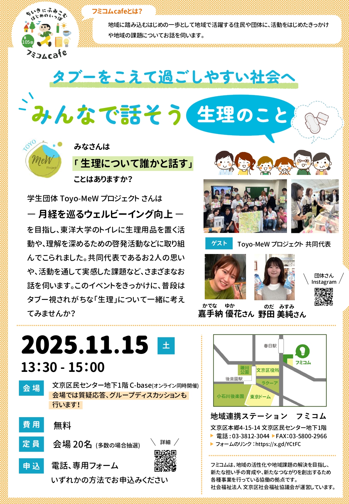 地域連携ステーション「フミコム」(文京区本郷4)で11月15日、性別を問わず「生理」について語り合えるイベント「タブーをこえて過ごしやすい社会へ~みんなで話そう生理のこと」が開催される。
