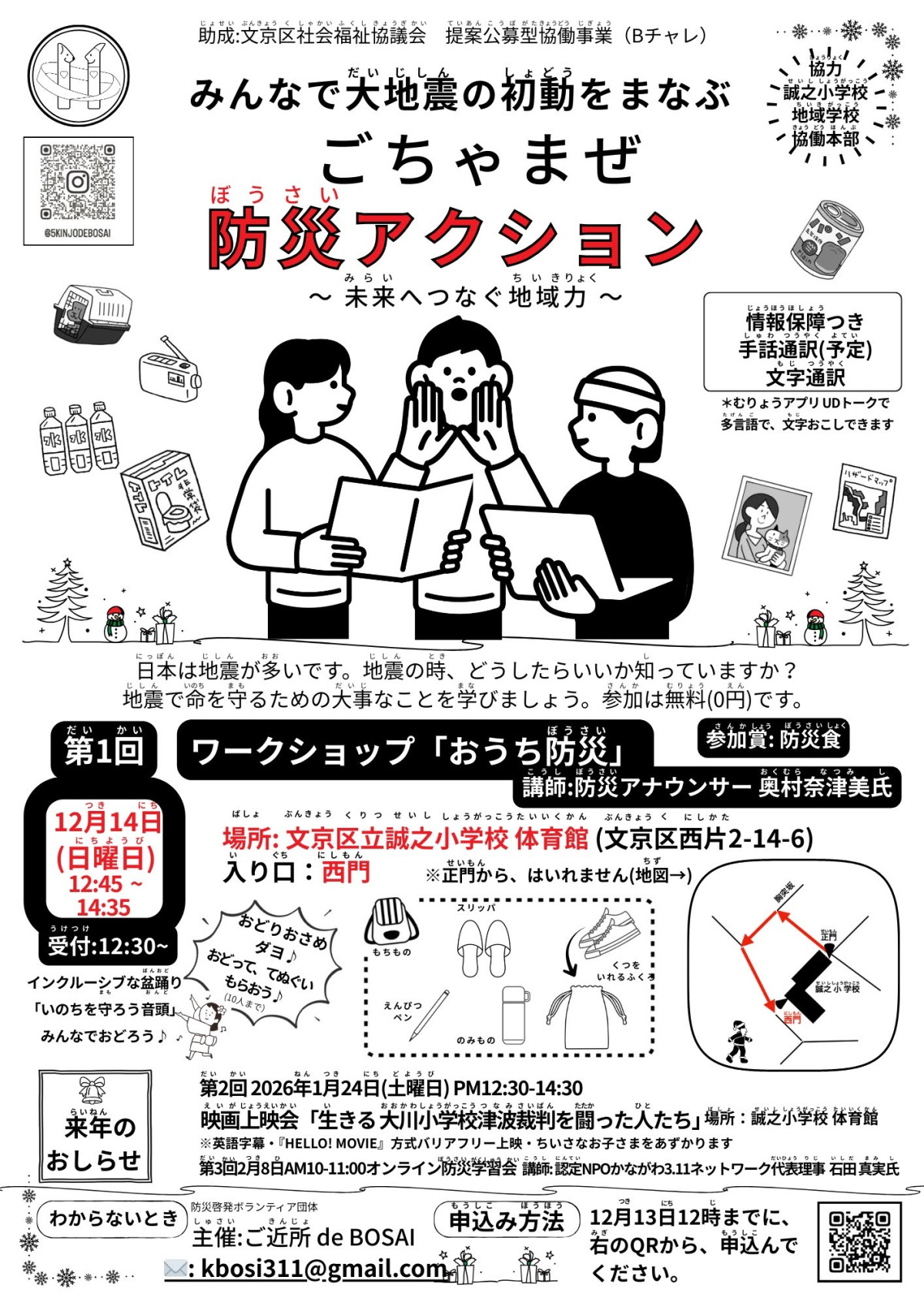 文京区立誠之小学校(文京区西片2)で12月14日、防災イベント「ごちゃまぜ防災アクション~未来へつなぐ地域力~」が行われる。