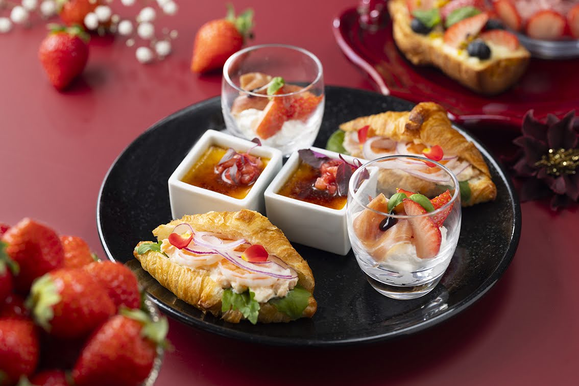 セイボリー「フォワグラのブリュレ 苺のアクセント」 「サーモンと海老のクロワッサンサンド」「苺とモッツァレラチーズのムース」
