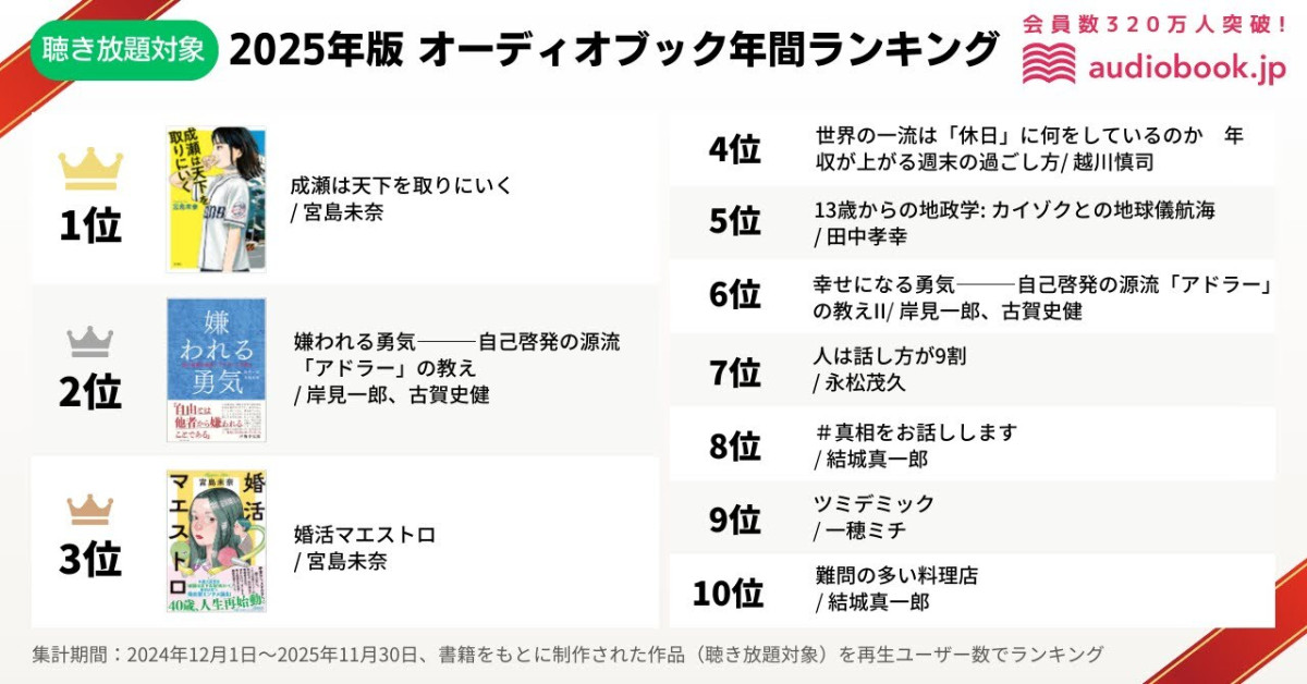 オーディオブック配信サービス「audiobook.jp」を運営するオトバンク(文京区本郷3)は12月9日、2025年の年間ランキングを発表した。