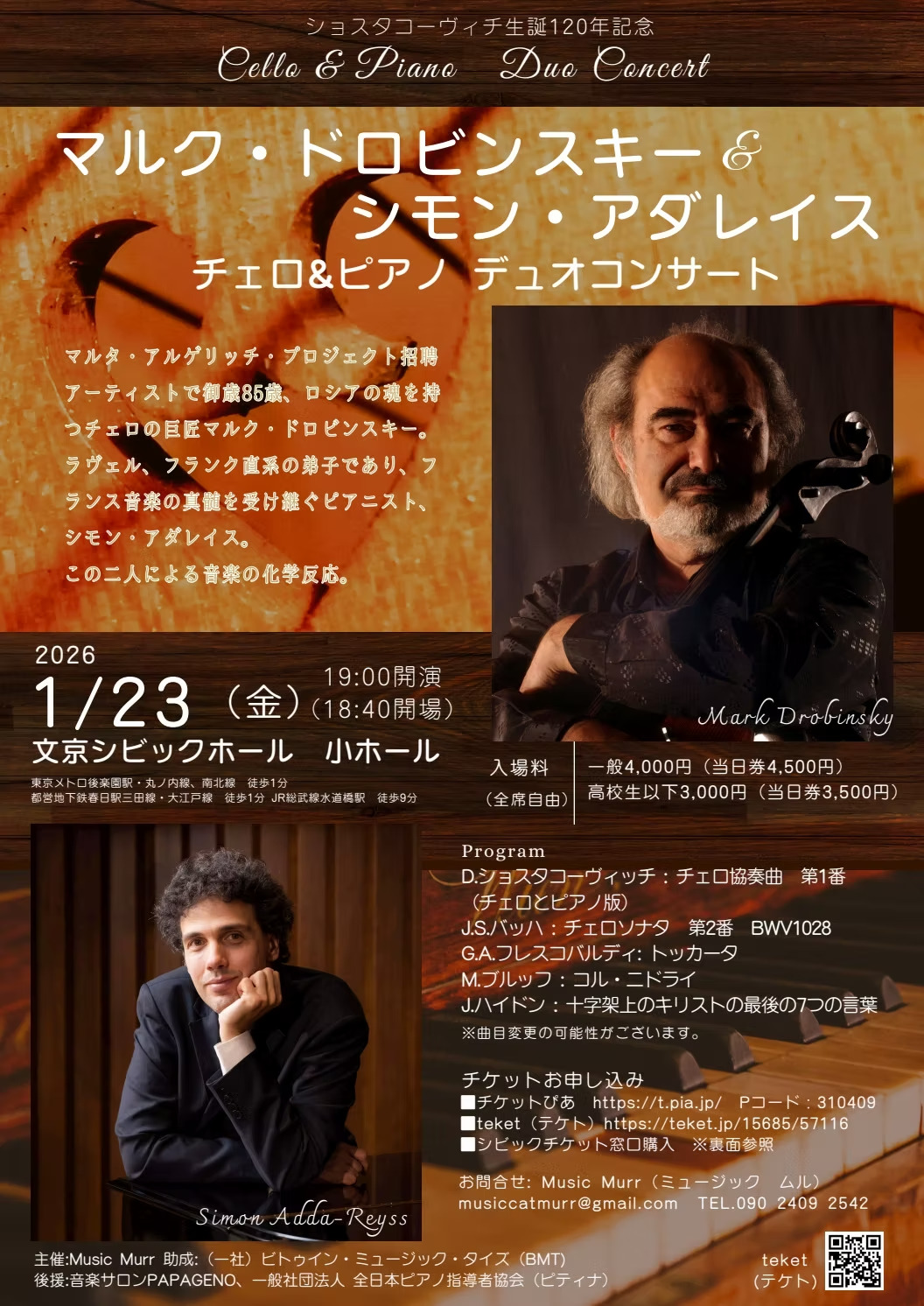 文京・春日の文京シビックホール(文京区春日1)で1月23日、85歳の世界的チェリスト、マルク・ドロビンスキーさんとピアニストのシモン・アダレイスさんによるデュオコンサートが上演される。