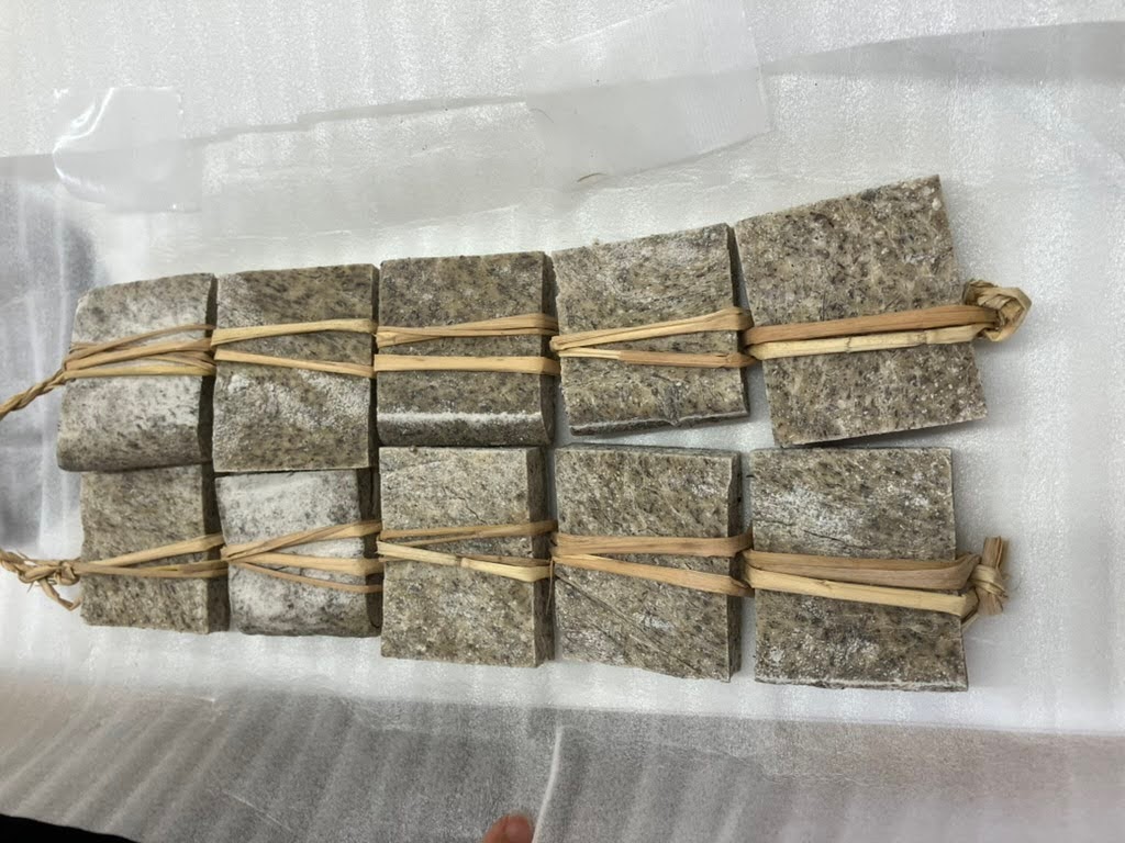 葛尾村の特産品「凍み餅」。藁で縛り、寒風にさらして乾燥させる東北地方の伝統的な保存食