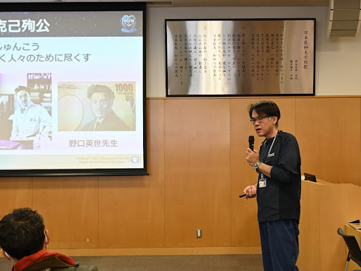 前回の講座で講演する横堀将司教授(日本医科大学付属病院高度救命救急センター)
