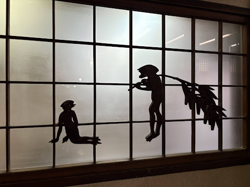 格子窓に描かれた人物シルエットの装飾。建物各所に残る細やかな意匠