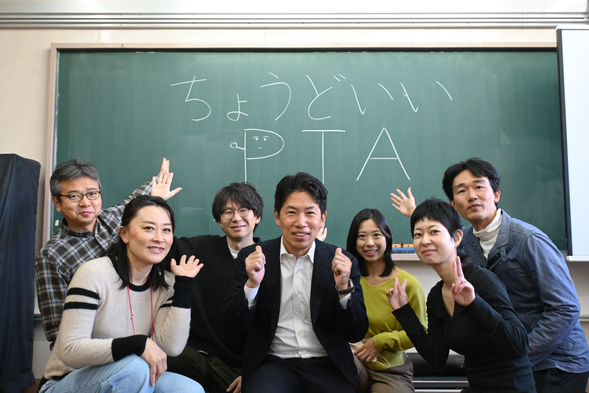 黒板に書かれた「ちょうどいいPTA」。改革を担ったメンバー