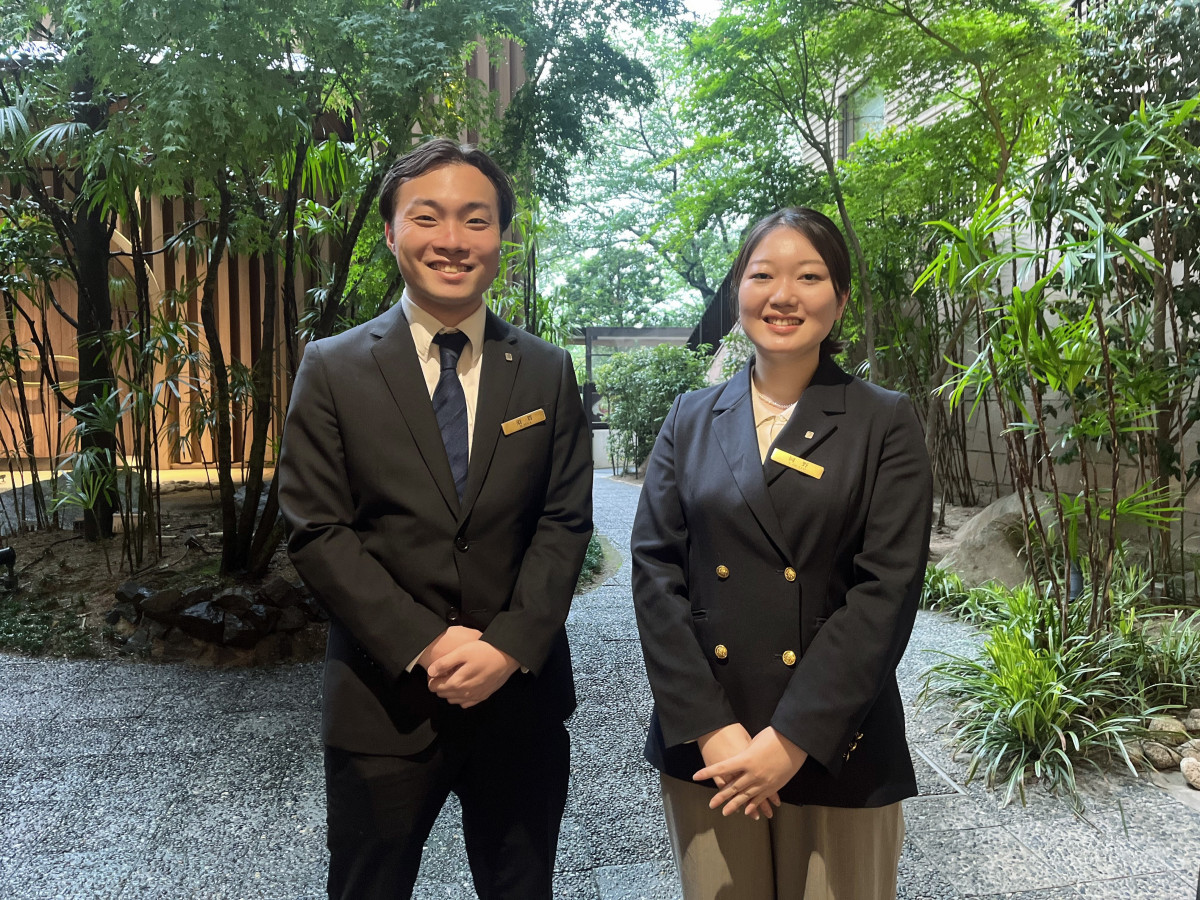 企画を担当した須賀政博さん(左)とマーケティング部門の岡野幸実さん(右)。庭園を背景に